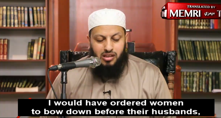 Wael Al-Ghitawi: “In the hadith compilation of Imam Ahmad (ibn Hanbal) it says: ‘No human being should bow down before another human being, but if this were allowed, I would have ordered women to bow down before their husbands, because of the magnitude of the husband’s rights over his wife. By Allah, if (a husband) has a boil oozing pus, anywhere from head to toe, the wife will not be doing him full justice even if she licks it clean.’ This is no trivial matter. These are the words of the Prophet Muhammad. Some people might find it difficult to stomach this hadith. I mean, if a man has a boil, does his wife really need to lick it? I am not saying that she must lick it. But the Prophet Muhammad demonstrated the magnitude of the husband’s rights over his wife by saying that even if she licks the boil, she would not be doing him full justice.[…]