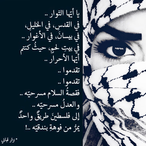 This poem, illustrated with the face of a girl wearing the keffiyeh, ends off with “The way to Palestine is through the barrel of a gun.”