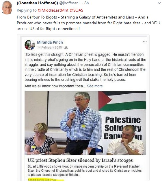 Moreover, Ms Pinch herself, the Anglican daughter of a Jewish mother from Czechoslovakia if I’m informed correctly, has raised eyebrows in linking to material from the notorious antisemitic Redress site that I understand most PSC types try, publicly at least, to avoid: